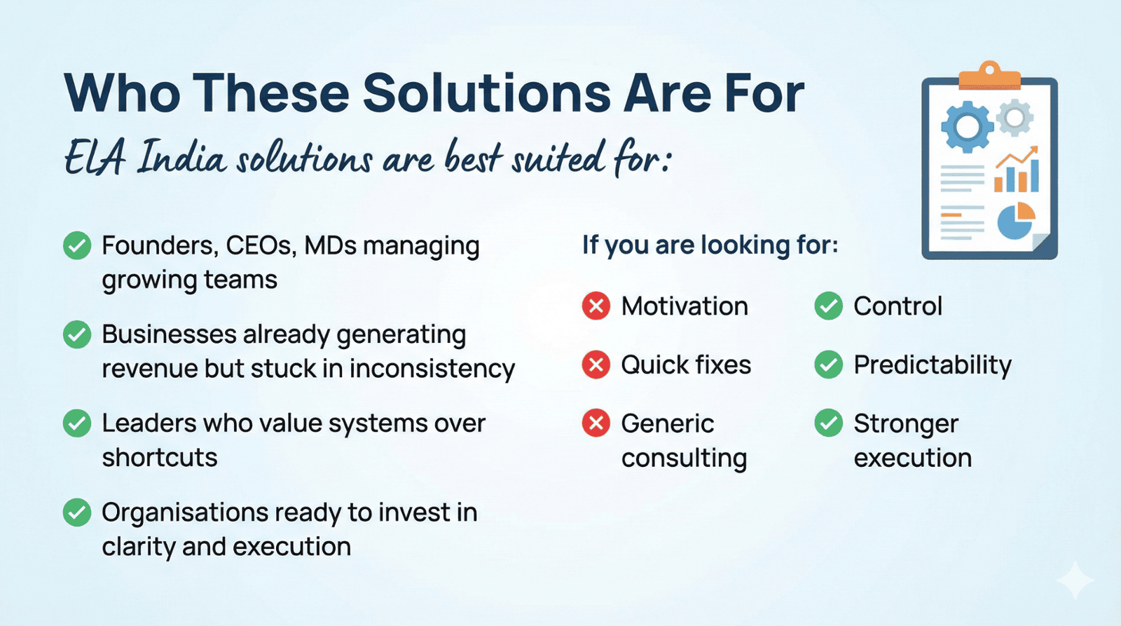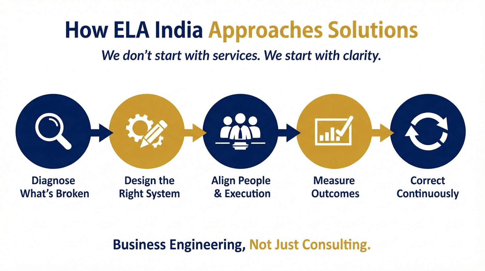 Most businesses don’t struggle because they lack ambition or hard work. They struggle because growth is being managed through effort, not systems. That’s where ELA India works best.